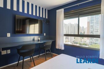 Studio localizado em Perdizes, na Rua Iperoig, construído em 2021, com decoração moderna, mobiliado, ar condicionado, cama de casal com cama auxiliar de solteiro (03 pessoas), armário, frigobar, armários para itens de cozinha, fogão por indução, micro-ondas e demais itens de mesa. Bem iluminado, a 45º metros da futura estação Perdizes do metrô, da Av. Sumaré, Allianz Park, Shopping Bourbon, PUC com inúmeras opções de comércio, lojas, bares, restaurantes numa parte mais plana da rua, onde é possível fazer tudo a pé.
